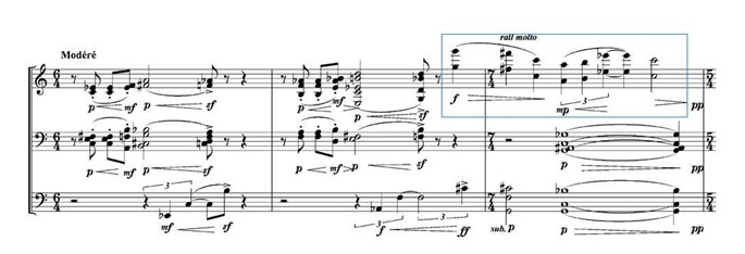 The second section is even tenser with a faster tempo and more passionate syncopations which demonstrate grievances. This is further demonstrated by the use of two violins on an octave interval (highlighted in blue in Fig.2). With the use of only two violins, the composer marked rall. (rallentando) molto, which means slowly and drastically, which is against the overall tempo of modéré, giving sharp changes to both the volume and tempo.