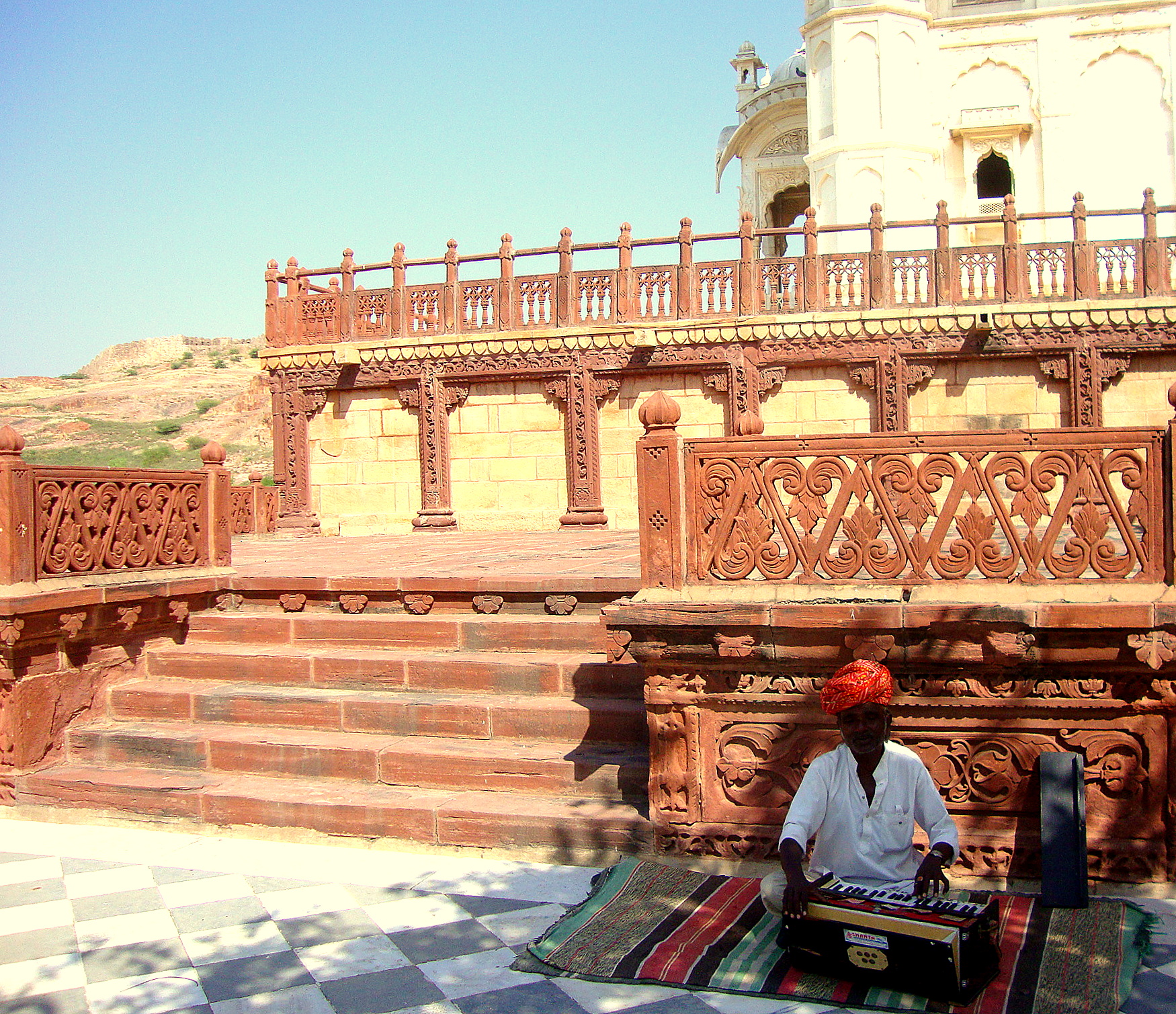 A Rajasthani musician playing the harmonium, an instrument originated from Europe and now an essential part of various Indian music styles.