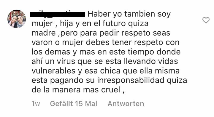 “Let’s see, I am also a woman, a daughter and in the future perhaps a mother, but to ask for respect, whether you are a man or a woman, you must have respect for others and even more so at this time when there is a virus that is taking away vulnerable lives and that girl who is paying for her irresponsibility in perhaps the cruelest way.”